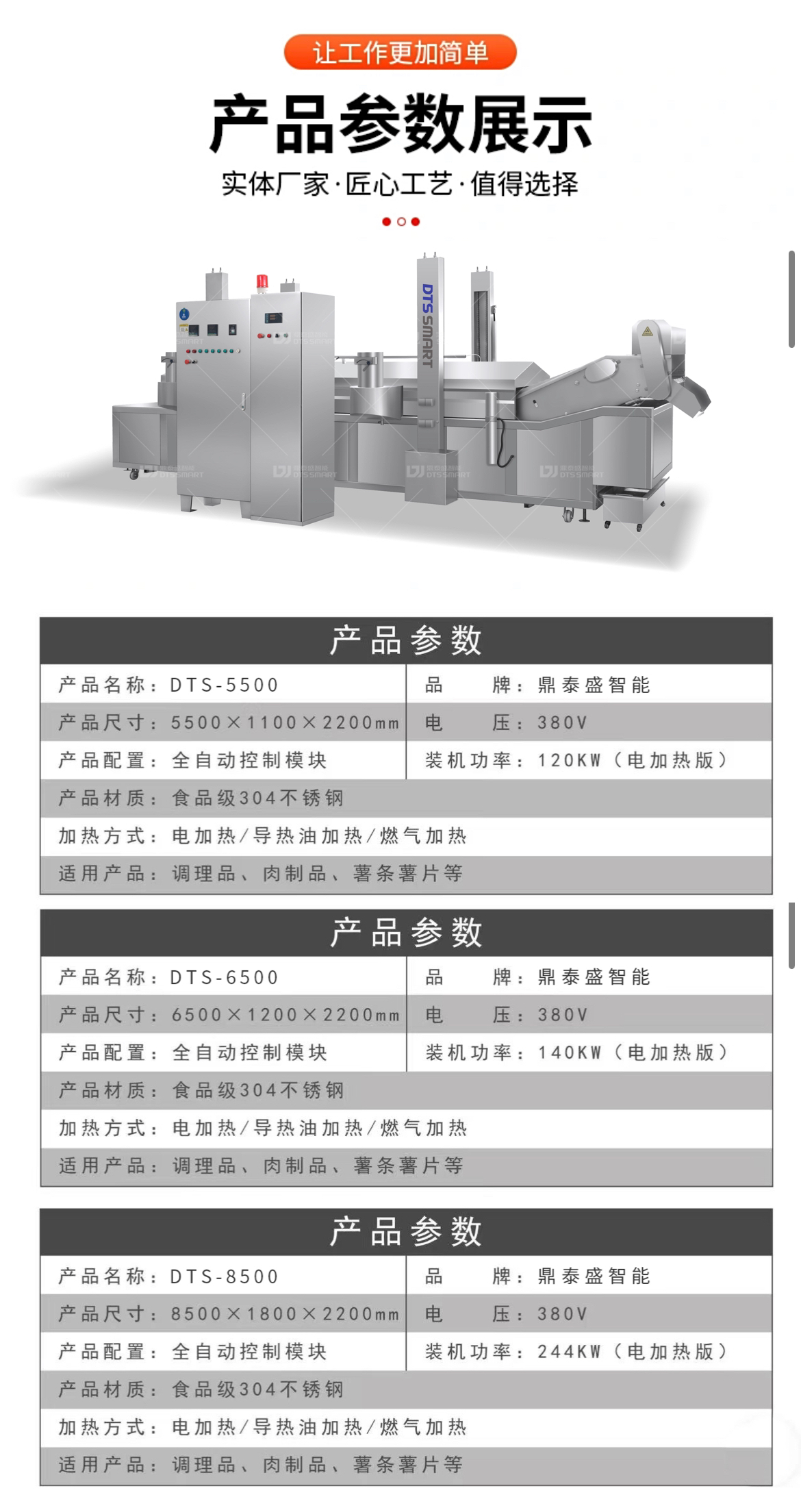 油炸流水线采用油水混合滤渣结构及全油纵向刮渣或侧刮系统,变频调速。油炸时,炸品的残渣沉入油槽下面的水中,残渣不会结碳,且可随水一起通过排污阀放掉。同时,残渣中所含大量的食用油经过油水分离后返回油层。这样,既大大延长了油的使用周期,降低了油的消耗,节油效果十分明显,又使得炸品色、香、味更佳,外观也更加干净漂亮。机器设置提升系统,能将输送机提升至适当的高度,使得对机器的清洗、检修极为方便。适合炸制时间在 15秒到8分钟内的用户的需要。经过技术处理,本机可适应各种不同的能源,以满足用户的不同要求。本机特别适用于大、中、小型企业使用。