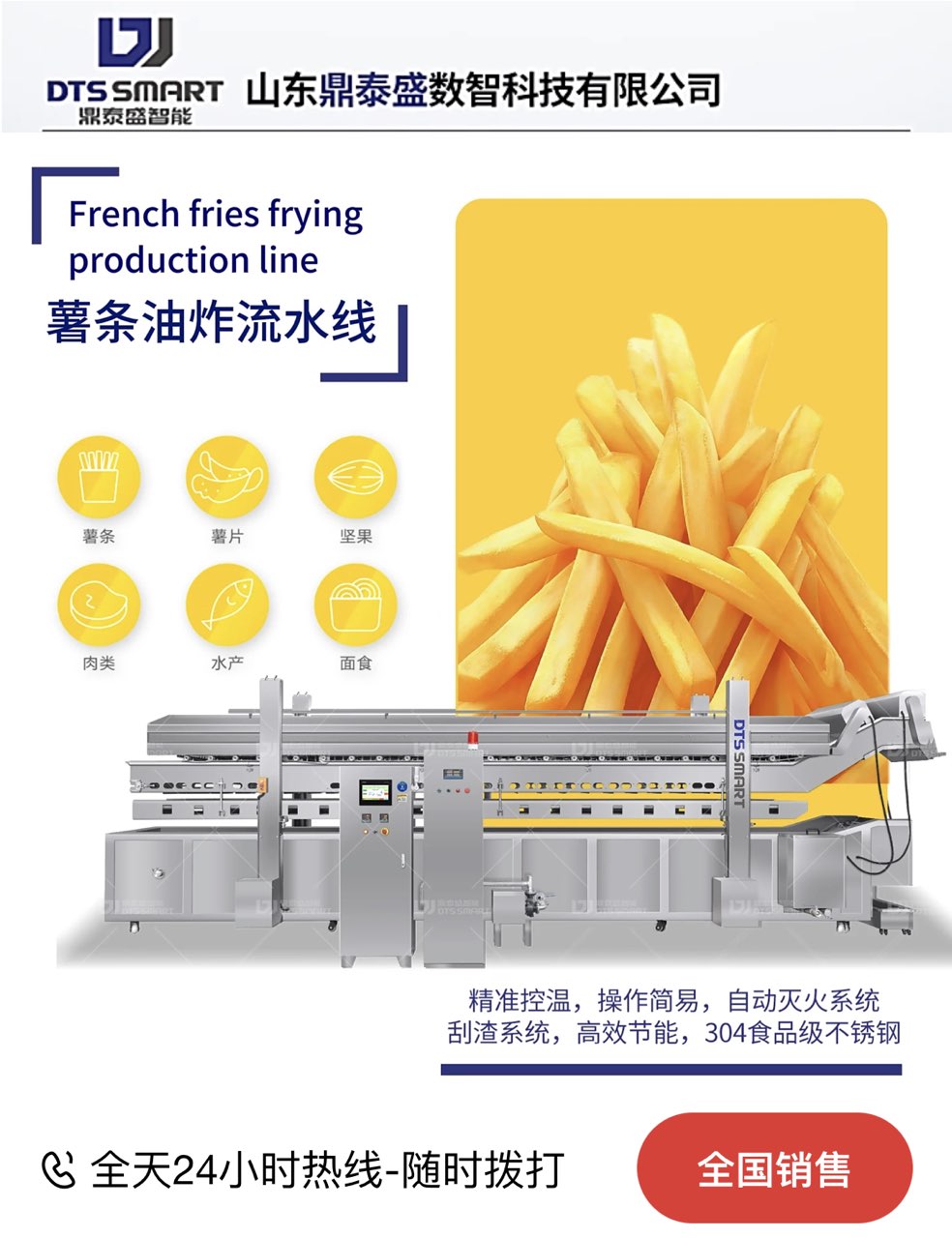 薯条油炸生产线是专门用于加工冷冻或新鲜马铃薯,通过自动化设备完成切割、清洗、漂烫、油炸、冷却、调味、包装等工序,最终生产出符合市场需求的油炸薯条(如快餐薯条、休闲零食薯条等)。该生产线广泛应用于食品加工厂、快餐连锁企业及休闲食品生产企业。